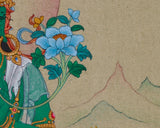 Green Tara, the "Mother of Liberation," embodies compassion, protection, and swift action. Her royal ease posture signifies her readiness to act and bestow blessings, while the blue utpala flower represents spiritual purity. The moon disc on a lotus seat symbolizes the enlightened mind and purity of Tara. This thangka embodies Green Tara's divine essence and serves as a powerful reminder of her unwavering blessings for those on their spiritual journey.