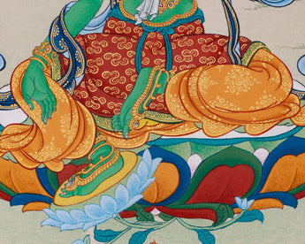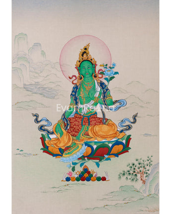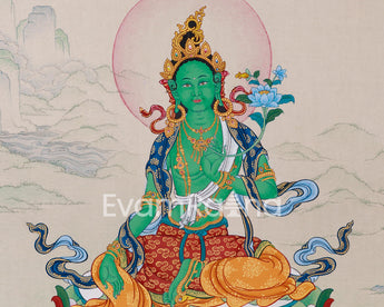 This intricately crafted Thangka features the beautiful and powerful goddess Green Tara. As the mother of liberation, Green Tara offers protection and helps overcome obstacles. This small Thangka is perfect for bringing blessings and inspiration into any sacred space.