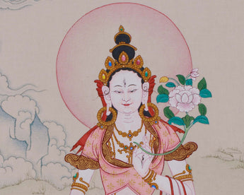 Mother White Tara, adored as the goddess of compassion, healing, and longevity, is important to Tibetan Buddhism. Her nurturing presence offers guidance and blessings for peace, health, and spiritual renewal. Created in accordance with the detailed instructions presented in traditional meditation guides, this piece of art serves as a spiritual instrument and a fine illustration of sacred artwork.