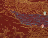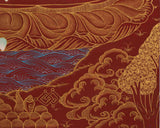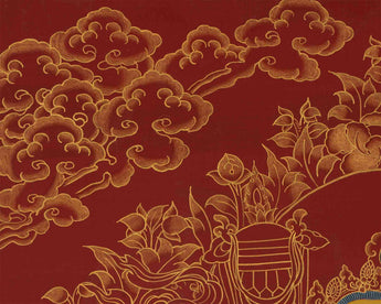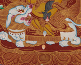 The red background symbolizes vitality, energy, and the transformative power of Namtose's blessings. Namtose's fierce and dynamic pose is a protective shield, driving away malevolent forces and ensuring the safety and well-being of his devotees. It amplifies his presence and spiritual potency, making it a powerful symbol of protection and divine support. This exquisite thangka is not just a work of art but a potent spiritual tool designed to inspire and empower practitioners.