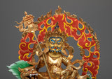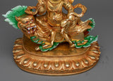 Handmade in traditionally old craftsmanship of Nepal, a skilled artist sculpted this beautiful piece with a copper body and gilded in genuine 24k gold. He sits atop a lion-like king, surrounded by a magnificently carved halo studded with precious stones. In his right hand, he clutches the victorious banner, and in his left, a mongoose spouts a wish-granting diamond. He dresses in silk gowns with gold ornamentation and elaborate patterns, and he wears a gold wreath on his head adorned with corals. He has three eyes and a semi-wrathful appearance.