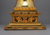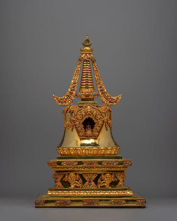 With a Copper body and a gorgeous Gold Plating , the Nirvana Stupa Statue is an amazing work of handcrafted spiritual art. This stupa, which rises to an amazing height of 53.5 cm, is an important Buddhist symbol, signifying the achievement of Nirvana, the ultimate freedom from the cycle of birth, death, and rebirth. The statue is richly embellished with inlaid Turquoise and Coral stones, which have profound symbolic implications of spiritual balance, healing, and protection, in addition to improving its aesthetic appeal.