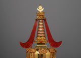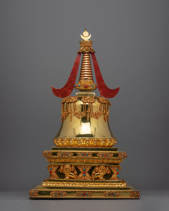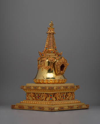 This Nirvana Stupa is a meaningful portrayal of the Buddha's teachings and the road to enlightenment, and it is not only a beautiful piece. This stupa is a focus point in any meditation area, altar, or religious setting because of the stunning contrast of the Gold Plating and the vivid blue Turquoise and Coral stones. This item will be a valuable addition to any spiritual collection because of the detailed craftsmanship, which genuinely displays the deep respect for Buddhist tradition.