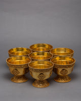 Offering Bowls are commonly used in Tibetan temples, shrines, and home altars and filled with offerings every morning as a way of collecting merit and virtue. They can hold different substances such as rice, fruits, yak butter, salt, ghee, water, flowers. They have the perfect size for shrine and can be stored easily. This set of Bowls is beautiful and the trim is an eye catching focal piece. They are great for anyone attempting practice in a confined area.