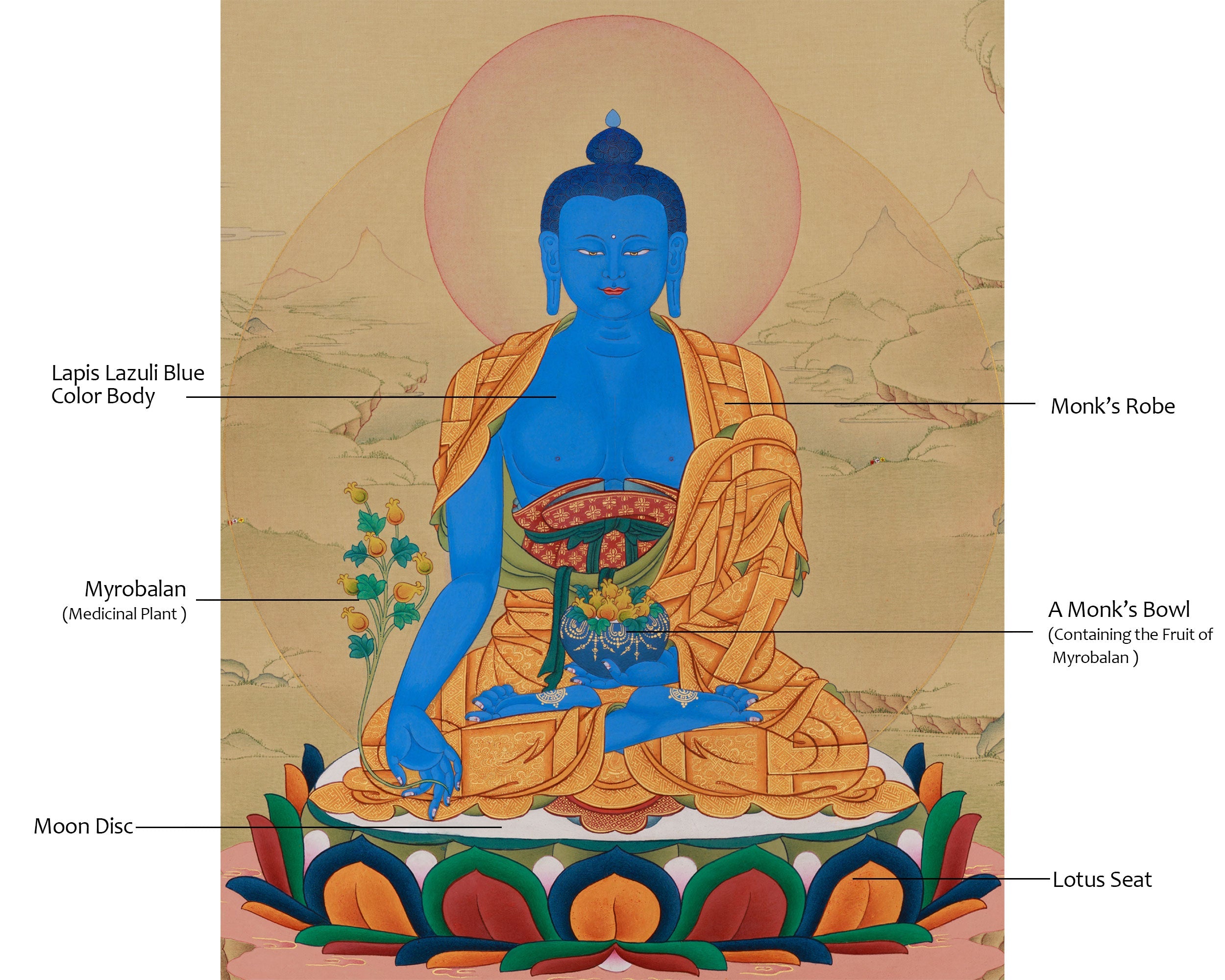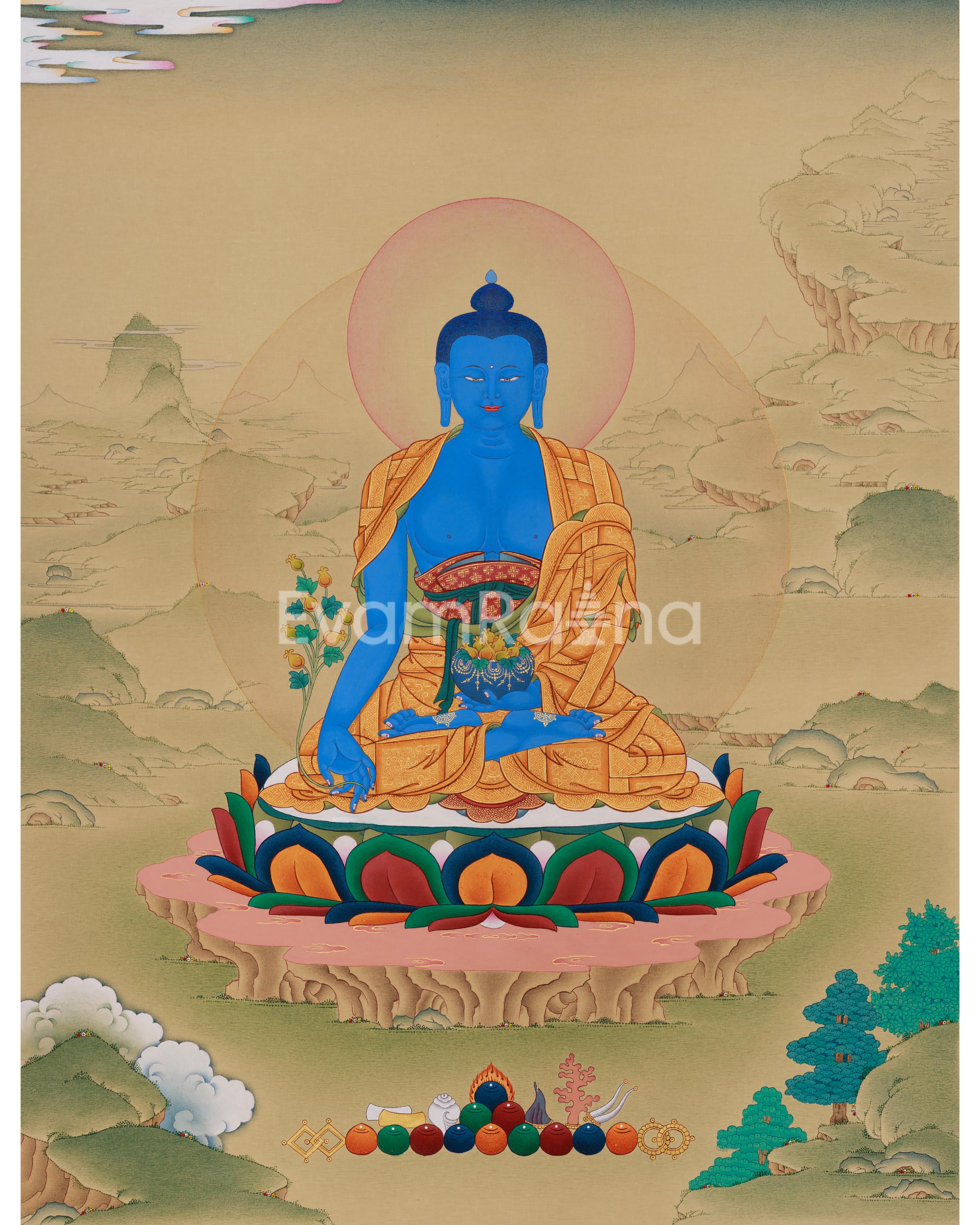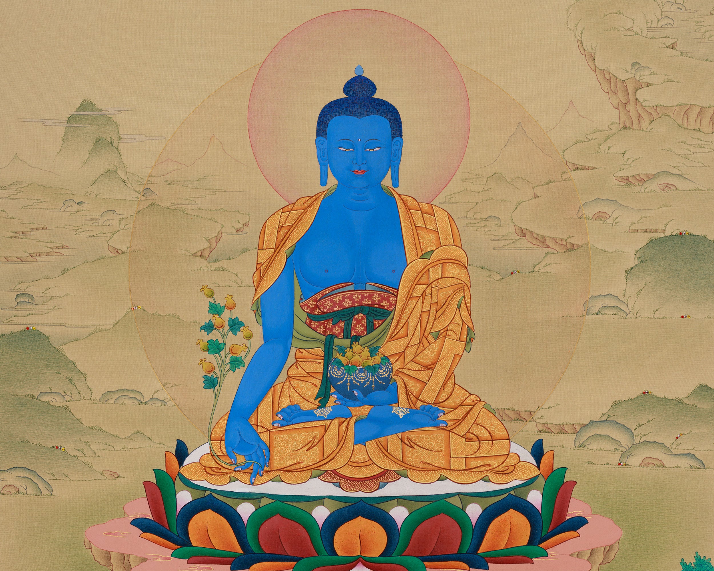 Seated in serene, meditative stillness, Bhaisajyaguru is portrayed with a lapis lazuli-blue body, symbolizing healing, wisdom, and inner peace. His right hand displays the gesture of giving (varada mudra) as he holds a stem of myrobalan, a healing plant recognized in Ayurvedic medicine. In his left hand, resting in his lap in meditation mudra, he holds a bowl of healing nectar that also contains the fruit of myrobalan, emphasizing his role as the ultimate physician of body and mind. He wears the simple robe of a monk, representing renunciation, while sitting atop a vibrant lotus and moon seat.