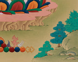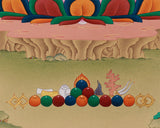 The thangka is created in the Karma Gadri style, characterized by vast landscapes, elegant lines, and a straightforward, balanced composition that emphasizes the central deity. Gold is carefully applied to highlight the Buddha’s robes, lotus throne, and bowl, elevating the divine quality of his presence. Every brushstroke reflects traditional craftsmanship and our studio’s commitment to preserving authentic Himalayan artistry. This thangka is of superior quality, reflecting the time, expertise, and spiritual significance involved in its making.