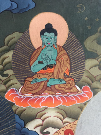 Please be informed that this thangka does not come with any kind of frame and is also not mounted in any kind of traditional Tibetan brocade.