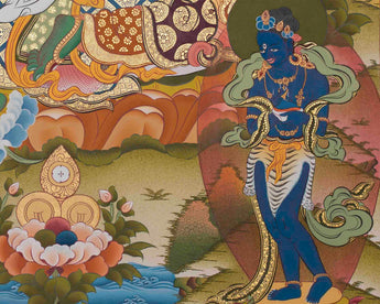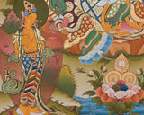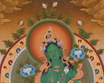 Green Tara, the "Mother of Liberation" in Tibetan Buddhism, is a revered figure who embodies compassionate action, offering protection and assistance to those in need. She is believed to respond swiftly to devotees' prayers, guiding them through life's challenges and helping them overcome fears and difficulties. This hand-painted thangka features Green Tara's serene expression and gentle smile, symbolizing warmth and kindness. Her right hand is depicted in the varada mudra gesture, while her left-hand holds a blue lotus, symbolizing purity and spiritual awakening. The vivid green hue of her skin represents her connection to the wind and her role in alleviating suffering and promoting growth. Surrounded by a tapestry of symbolic elements, this thangka is not just an artistic masterpiece but also a powerful spiritual artifact, serving as a visual reminder of Green Tara's blessings and the transformative power of compassion.