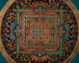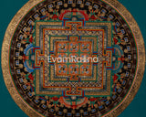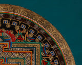 At the center of this mandala is the cosmic palace, which represents universal order and the enlightened mind. Concentric layers of elaborately etched sacred mantras radiate outward, forming a protective spiritual energy field. Each mantra syllable, imbued with ancient wisdom, functions as a vibrational key to achieving greater awareness and expanding one's connection to the divine.