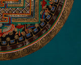 The gold accents sparkle against the bluish-green background, heightening the Thangka's celestial aura and emphasizing the delicate details. The outermost ring, embellished with golden Tibetan images and sacred inscriptions, serves as a spiritual boundary, preserving the mandala's holy vitality. The four directional gates, decorated with ornate architectural patterns, represent the paths to enlightenment, allowing the visitor to enter the realm of wisdom and compassion.