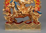 The 24k gold gilding and detailed acrylic paintings bring this copper statue to life, expressing every essence of Palden Lhamo's wrath and might. Her fierce look and commanding posture serve as a reminder of her unwavering dedication to preserving Buddhism's teachings and real practitioners.