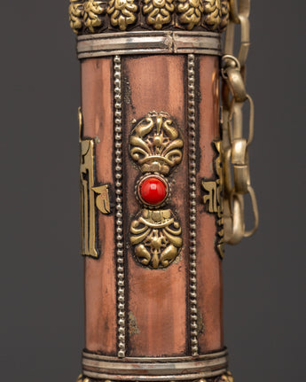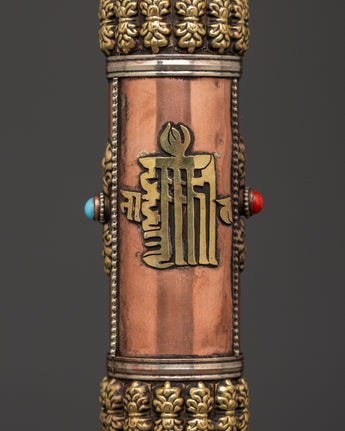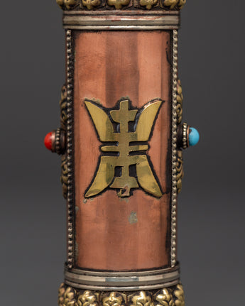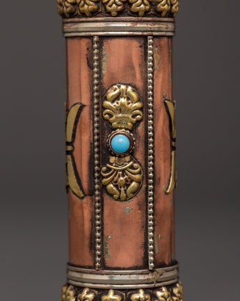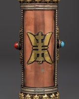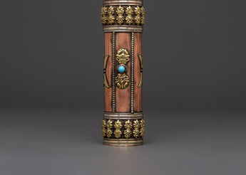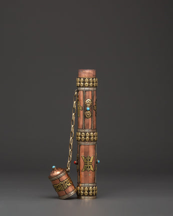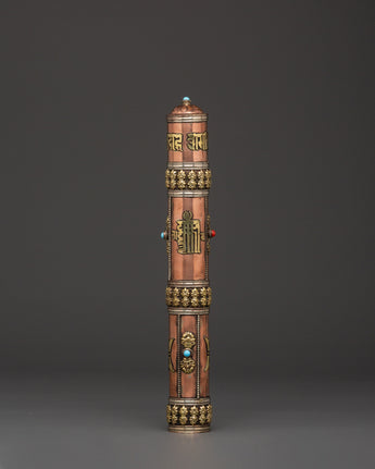 This copper incense tube is both functional and visually appealing. The intricate carvings of sacred symbols and the engraved mantra "Om Mani Padme Hum" lend a touch of spiritual beauty, making it ideal for use in meditation rooms, Buddhist shrines, or as a thoughtful gift for practitioners. Its portable design allows you to safely transport your incense, whether attending a ceremony or visiting a spiritual spot. Enhance your spiritual practice with this handcrafted incense case, which combines tradition and beauty.