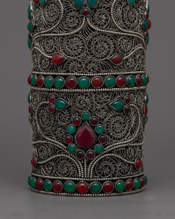 This portable snuff bottle, which stands an impressive 24 cm tall, is more than just a work of art; it's a spiritual companion that invites you to delve deep inside yourself. The silver plating adds a touch of elegance and mystique while the copper body gives off a welcoming and warm aura.