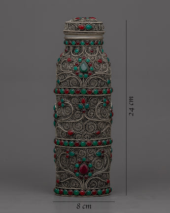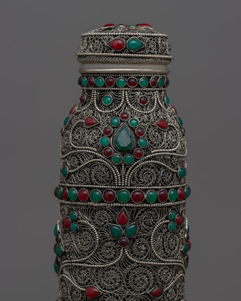 This bottle stands out because it contains priceless gems, including emerald and ruby. These stones give the bottle a vibrant energy and are renowned for their spiritual significance. While emerald stands for growth and renewal, ruby is a symbol of passion and bravery. Together, they produce a harmonious synthesis of aesthetic and spiritual beauty.
