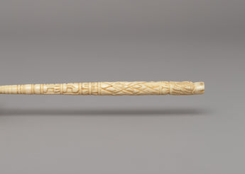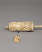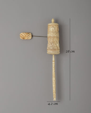 This hand-carved Prayer Wheel is made of buffalo bone and features intricate craftsmanship. The wheel measures 28 cm in height and 4.2 cm in width, and weighs 0.16 kg, making it suitable for ritual use. The prayer wheel is designed with traditional Tibetan motifs, emphasizing its spiritual significance. It has intricate carvings on its cylindrical body representing peace, mindfulness, and the repetition of mantras during meditation. The wheel is attached to a long handle, making it easy to hold and rotate during rituals.