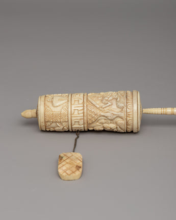 Tibetan Buddhists use prayer wheels to spread blessings, wisdom, and compassion. As the wheel spins, the prayers and mantras within it are symbolically recited, increasing their power. The physical act of turning the prayer wheel aligns the practitioner's intentions with the universal flow of positive energy, thereby purifying the mind and cultivating a deeper connection with the Buddha's teachings. This particular prayer wheel, made of buffalo bone, is thought to have added significance because of its material, which is often associated with strength and spiritual foundation.