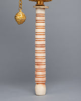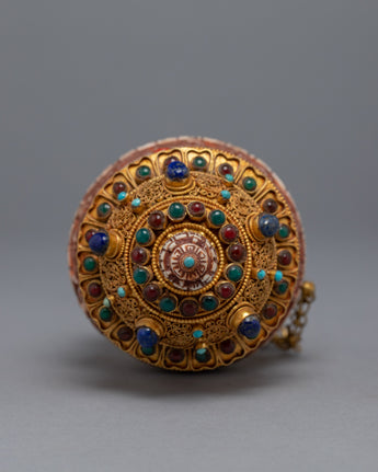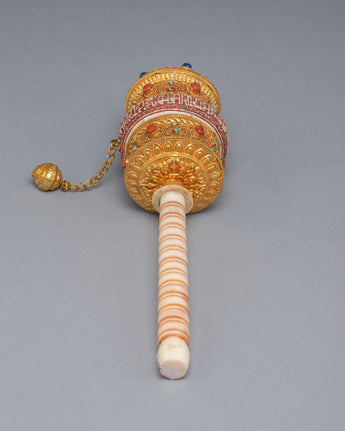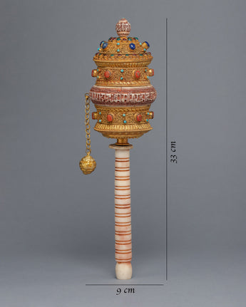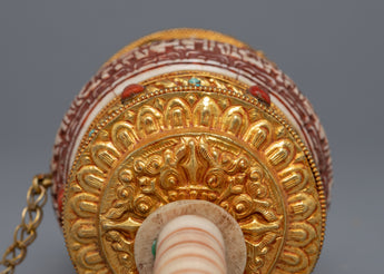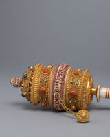 In Tibetan Buddhism, the Tibetan Prayer Wheel is a sacred object used to recite mantras and offer prayers. It is thought that spinning the prayer wheel has the same effect as reciting the mantra or praying. The mantra is carved on the stones of this prayer wheel, which is handcrafted on a copper body. The gemstones are embedded in the wheel, adding a beautiful touch to the holy object. It exemplifies the intricate craftsmanship that goes into making these prayer wheels, as well as the spiritual significance they hold for those who use them.