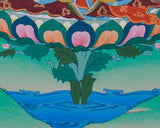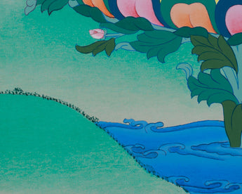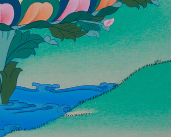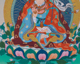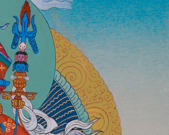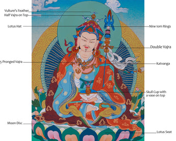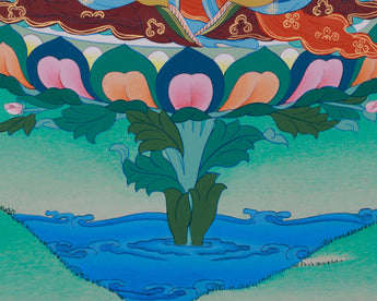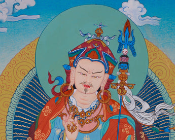 Precious Master Guru Rinpoche Thangka, who introduced Vajrayana Buddhism to Tibet, is shown in this thangka, which is painted in our Enlightenment Studio. It is rendered in the traditional Karma Gadri Style, made on cotton canvas using acrylic colors and embellished with 24K gold. In the royal ease pose (Lalitasana), Guru Rinpoche is shown in a vajra posture, holding a vajra and a skull cup.