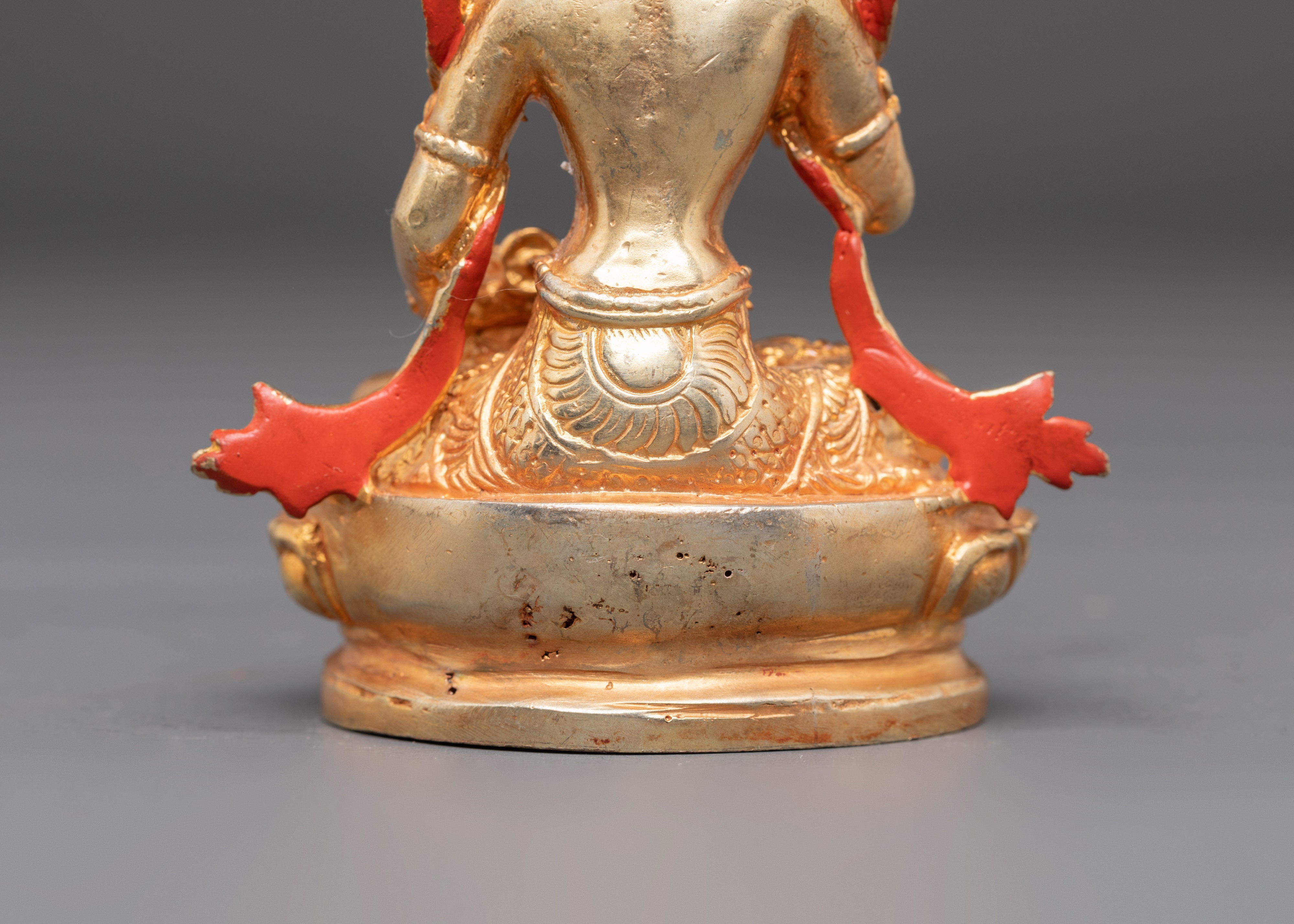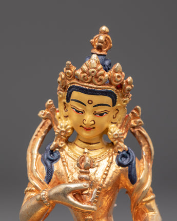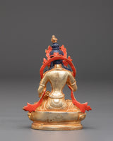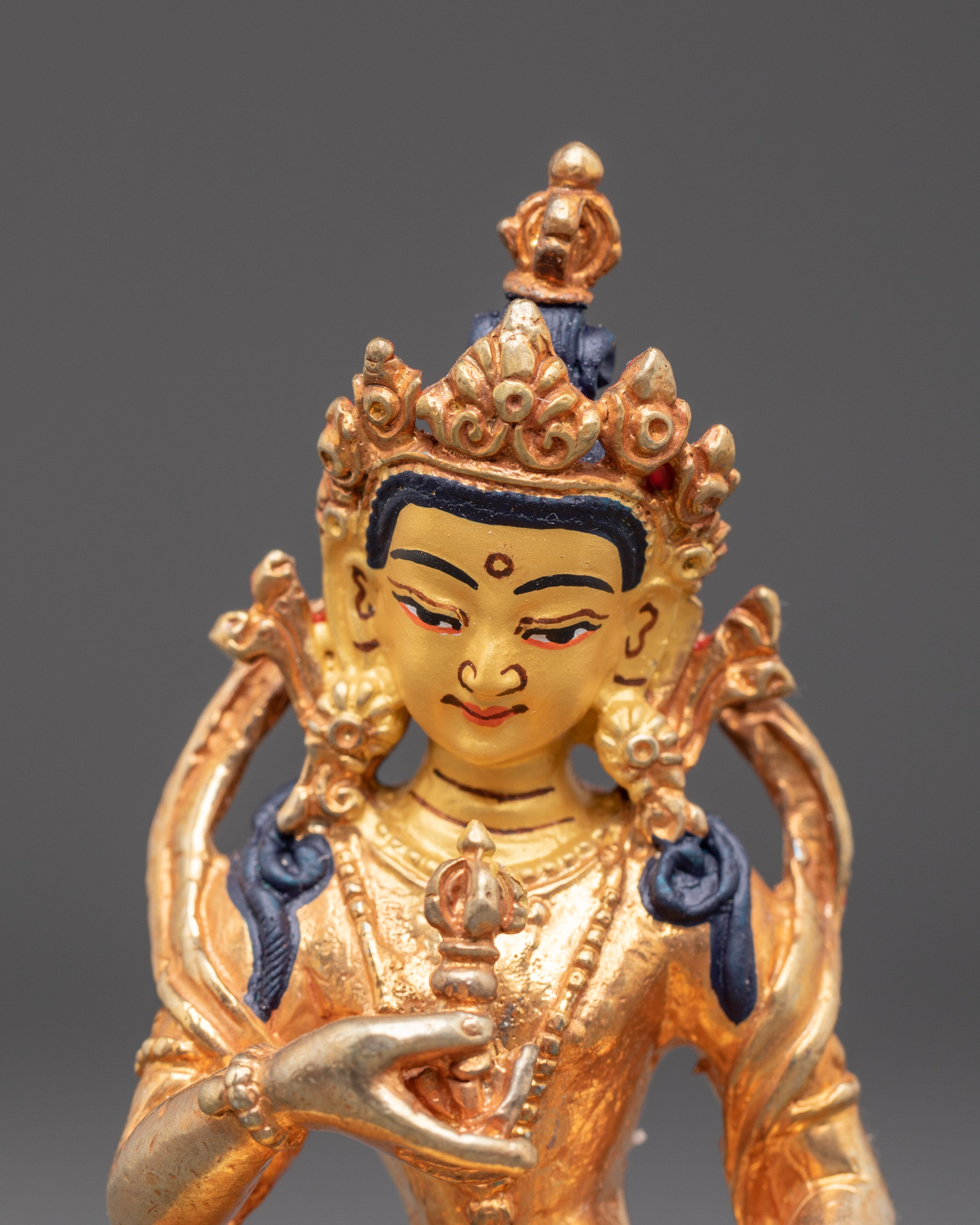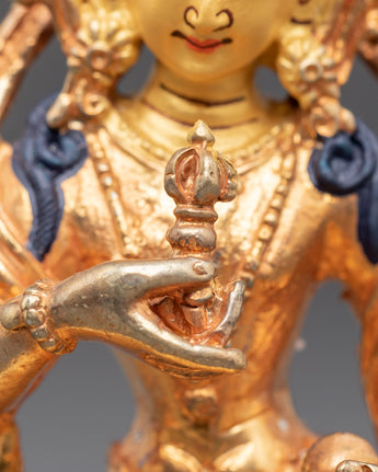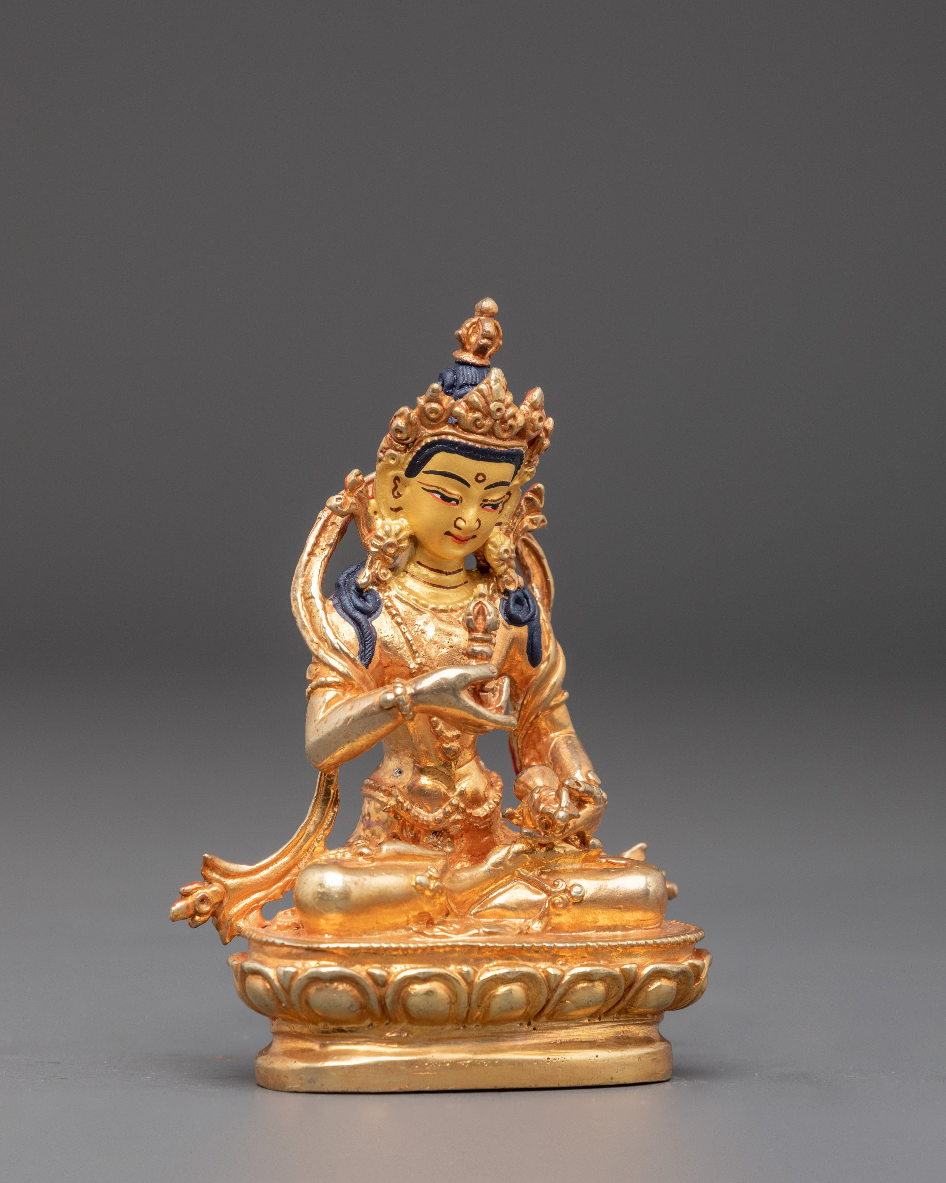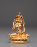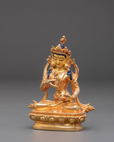 The statue's details, such as the divine features on his face and the delicate folds of his robes, are accentuated by the gold-plated finish. The lotus foundation on which Vajrasattva sits represents the blossoming of wisdom and enlightenment, while his position represents cleansing. This statue is a sacred tool that helps with spiritual change, purification, and the removal of negative energies. It also makes a lovely adornment.