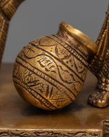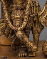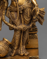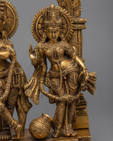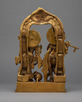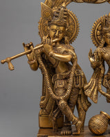 We have exclusively hand-crafted this Radha and Krishna statue using brass. The statue's elaborate detailing and construction are just breathtaking. Radha and Krishna are shown in a loving embrace that represents their heavenly love and is rendered with exceptional grace and elegance. Krishna, the fun and mischievous god, is pictured with a peacock feather in his hair and a golden flute in his hand. At the same time, Radha, the symbol of love and devotion, is seen wearing a flowing robe embellished with elaborate designs and gold jewels.