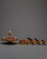 Embellished with beautiful gold details, our 6" Mandala set can be a valuable addition to your ritual altar. The Rice Offering set is appreciated as artwork for their elegance and naturally balanced nature of the outer world and the inner mind. This Mandala Set is made of mercury and partly gold and is delightfully hand-carved with lovely Ashthamangala symbols.