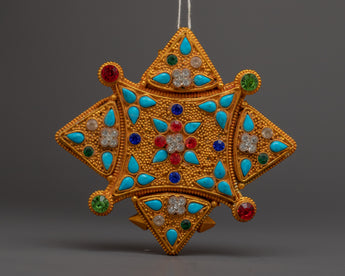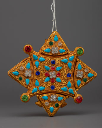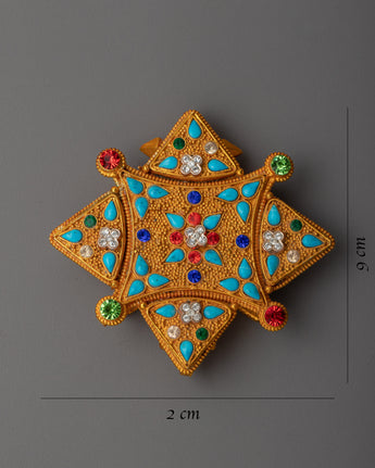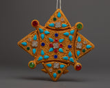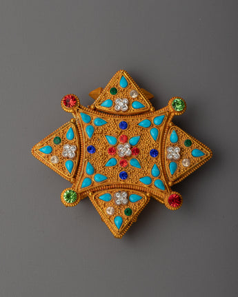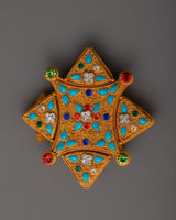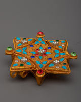 Introducing the Ritual Amulet Prayer Box Ghau, a magnificent work of art that was painstakingly crafted by hand on a copper body. This holy ghau is plated with gleaming 24k gold, which radiates a divine aura. It exudes beauty and spiritual significance due to the exquisite gemstones embedded in it. Even though it is only 9 cm in length, this ghau is incredibly powerful and symbolic, acting as a container for your prayers and holy items. Take it with you as you set out on a spiritual enlightenment and protection journey. Allow the Ritual Amulet Prayer Box Ghau to be your ally as you cultivate your spirituality and connect with the divine.