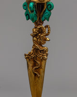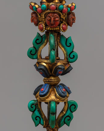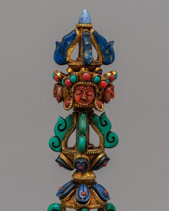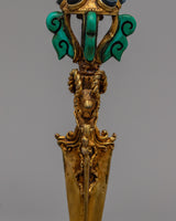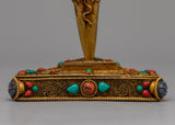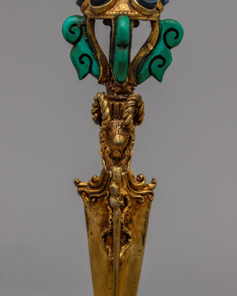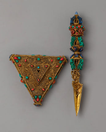 The precious stones this Phurba proudly displays—Coral, Lapis Lazuli, and Turquoise—are what truly distinguish it from others. With Coral symbolizing vitality, Lapis Lazuli wisdom, and Turquoise healing energy, each of these gemstones has a sacred meaning. The Phurba is a powerful tool for your spiritual endeavors thanks to the divine energies that are infused into it by this trio of gemstones.