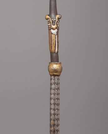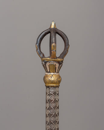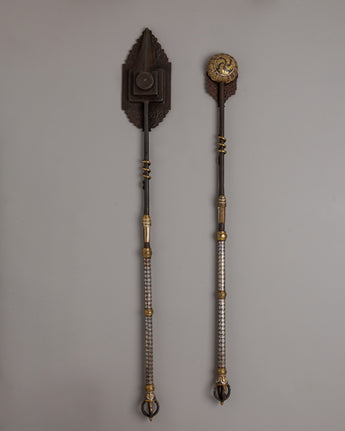 Immerse yourself in the holy traditions of Buddhist ceremonies with this Fire Offering Ritual Spoon Set, a work of spiritual art. This set emanates devotion and beauty, meticulously crafted from iron and embellished with 90% silver and brass inlays. The square spoon is 92.5 cm long, and the round spoon is 81.5 cm tall, with a total weight of 2.96 kg, ensuring both durability and elegance. These spoons are more than simply tools; they are holy containers that represent the purity of your gifts, giving your ceremonies tremendous meaning.