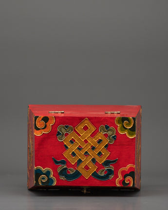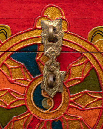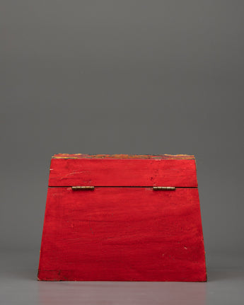 This elaborate Tibetan box is a helpful storage solution and an attractive décor piece. It is perfect for holding jewelry, prayer beads, sacred items, or ceremonial materials. The striking shades of red, gold, and green evoke traditional Tibetan beauty and provide an aura of cultural elegance to any area. This distinctive wooden treasure box exudes a strong sense of tradition, devotion, and sacred energy, whether used for personal belongings, as a spiritual present, or as an altar decoration.