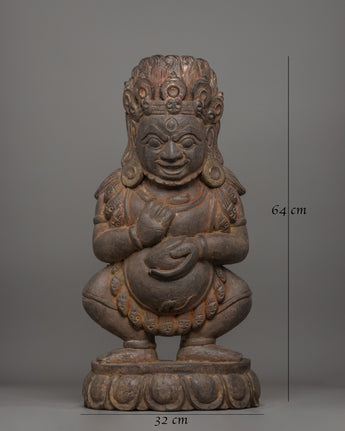 The Shakya Mahakala figurine stands 64 cm tall, is crafted from wood, and weighs 4.71 kg. As a powerful protector and one of the key deities in Tibetan Buddhism, Mahakala is shown with a semi-wrathful expression, highlighting his protective and transformative powers. His face is detailed with teeth, emphasizing his ability to ward off evil and remove obstacles. The third eye on his forehead symbolizes his ability to see through illusions and understand the truth. His long ears, adorned with circular earrings, emphasize his alertness and wisdom. At the same time, his curly hair represents his dynamic, untamable nature as he dances in a pose that conveys both strength and movement.