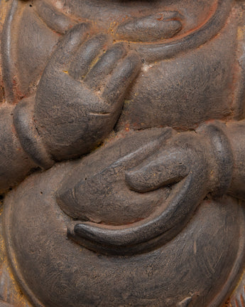 The figurine is seated on a sun disc lotus base, symbolizing his purification and the unfolding of wisdom through his fierce appearance. His dancing posture reflects his dynamic, energetic nature, continually working to destroy ignorance and clear the path for spiritual growth. Mahakala’s form is both fierce and compassionate. He helps practitioners by removing obstacles, allowing them to progress toward enlightenment. This finely crafted statue captures the perfect balance of wrath and compassion, representing Mahakala’s role as a protector and guide in Buddhist practice.