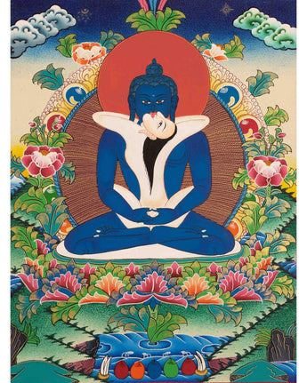 In this thangka painting Samantabhadra is depicted embracing his consort Samantabhadri in Yab-Yum, the sacred union.