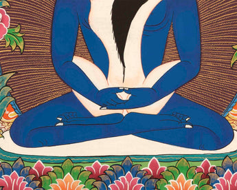 The color of his skin is blue and he sits naked in a 'vajra' posture, with his two hands placed on his laps in the gesture of meditation.