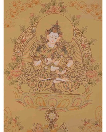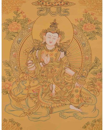 Samatabhadra, also known as Samantabhadra, is a respected Bodhisattva in Mahayana Buddhism that represents compassion, wisdom, and selflessness. The name translates to "Equal Enlightenment" or "Universal Worthy." Samatabhadra represents the use of skillful means and moral conduct to achieve enlightenment for the benefit of all beings. Samatabhadra is shown in a variety of ways and signifies all sentient creatures' natural potential for enlightenment. He is seated on an elephant in Buddhist iconography, a depiction rich in meaning. The elephant signifies knowledge, strength, and auspiciousness in many civilizations, and serves as an effective metaphor in this picture. This thangka invokes the Bodhisattva's compassionate counsel, encouraging practitioners to acquire virtues and embark on the path to enlightenment with steady determination, gaining strength from the enduring knowledge and compassionate nature of Samatabhadra.