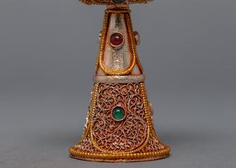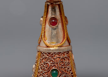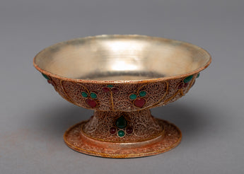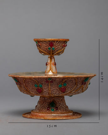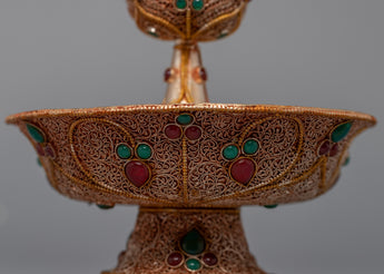 On a copper body, the Serkyem Offering set is expertly made. The meticulously inlaid gemstones increase the set's beauty and value. Enlightened beings receive a beverage comprised of two liquids, often water and alcohol, in the traditional Tibetan ceremony known as the Serkyem Offering. The set includes two cups, one smaller and one larger, to represent the two liquids.