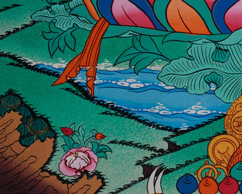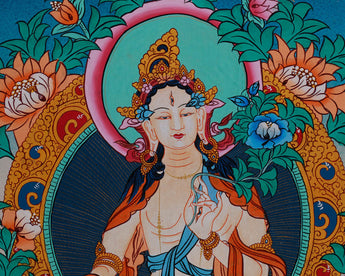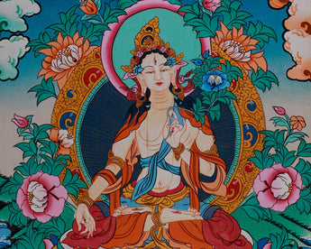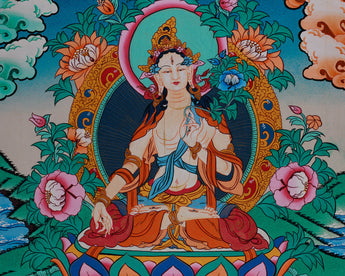 An ideal addition to your altar, interior design, or spiritual practice, this Thangka is a potent spiritual instrument for protection, healing, and meditation. Let White Tara's blessings of longevity, health, and compassion bring tranquility and well-being into your life.