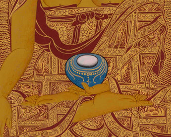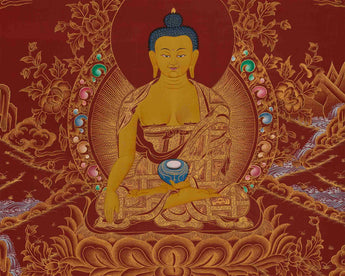 The Shakyamuni Buddha Thangka is a powerful and symbolic Tibetan Buddhist art piece that depicts the historical Buddha Siddhartha Gautama in a moment of profound spiritual significance. The Buddha is depicted in a classic lotus posture, with his right hand gracefully touching the earth in the "Bhumisparsha Mudra," symbolizing his victory over the forces of Mara and his call to the earth to bear witness to his realization of the ultimate truth. His left hand rests gently in his lap, holding a begging bowl, symbolizing his renunciation of worldly desires and his life as a mendicant monk.