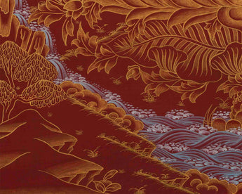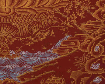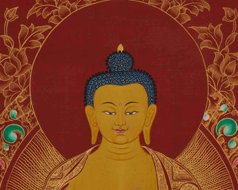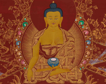 The deep red background of the thangka is associated with the fire element, symbolizing the transformative power of wisdom and passion that can lead to spiritual awakening. The vibrant red contrasts with the serene golden hues of the Buddha's skin and the intricate patterns of his saffron and crimson robes. Gold accents highlight the divine nature of Shakyamuni Buddha and his enlightened state. The red background also symbolizes the energy of compassion and warmth of the Buddha's teachings, which have the power to burn away ignorance and suffering.