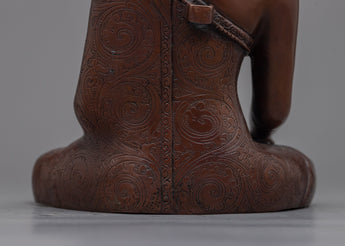 Introducing our Shakyamuni Buddha Oxidized Copper Statue, handcrafted with dedication to detail by skilled artisans in Patan, Nepal. Standing 24cm (9.4 inches) tall and with a base of 15cm (5.9 inches), this statue depicts the essence of Shakyamuni Buddha, the founder of Buddhism, famed for his deep teachings on suffering, enlightenment, and the way to Nirvana.