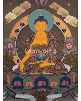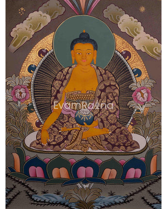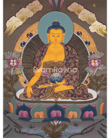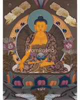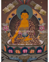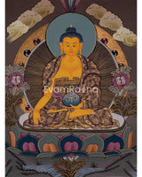 This Shakyamuni Buddha thangka is a traditional Tibetan Buddhist painting depicting Siddhartha Gautama, the historical Buddha who founded Buddhism in ancient India. These thangkas are intricately detailed and rich in symbolism, depicting Siddhartha Gautama in a seated meditative posture with his right hand touching the earth in the bhumisparsha mudra gesture. He is adorned with traditional robes and ornaments, and his facial expression reflects tranquility and compassion. Surrounding him are Buddhist depictions, such as lotus flowers symbolizing purity and enlightenment, Bodhi trees representing his enlightenment site, and scenes from his life.