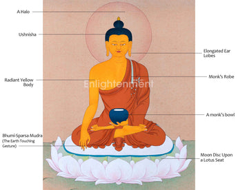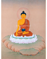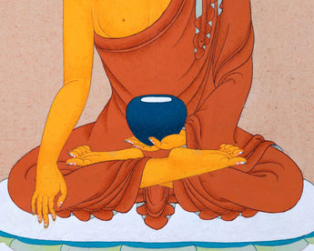 In our studio, we have meticulously hand-drawn the Shakyamuni Buddha Wall Art For Living Room Decoration. We incorporated cotton canvas and acrylic colors to complete this artwork. In this thangka, the deity is depicted seated on a moon disc lotus seat with a peaceful expression. His right hand holds an alms bowl, and his left-hand touches the ground in an earth-touching mudra position. This thangka painting is versatile and can be used for various purposes, including regular meditation, Buddhist rituals, or home décor. We used genuine 24K gold as a finishing touch to further enhance the deity's features. The thangka of the historical Buddha serves as a symbol of enlightenment and is an excellent gift for a devoted individual like yourself.