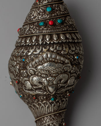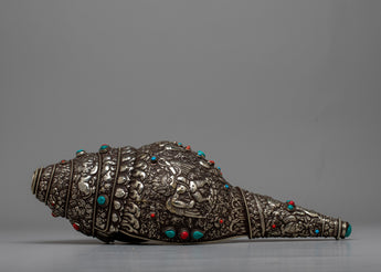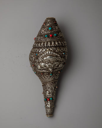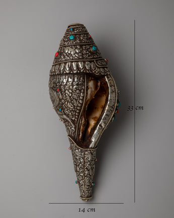Savor the breathtaking beauty of our Shankh Decoration, which is expertly created from white metal and features a detailed Norbu carving. This masterwork's every detail radiates elegance and spiritual grace, bringing a hint of celestial brilliance to any hallowed place or ceremonial context.