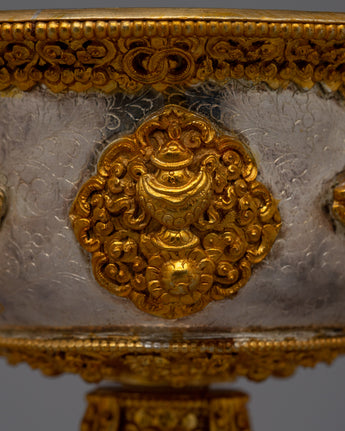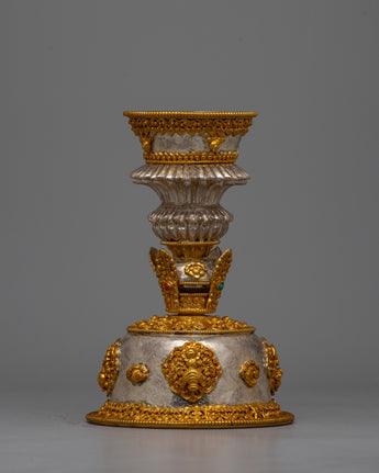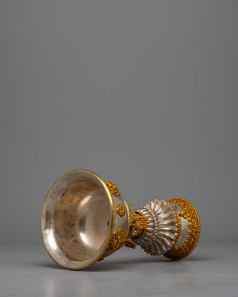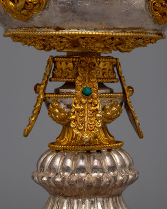 The Silver Butter Lamp Set is a beautiful example of traditional craftsmanship with spiritual meaning. Handcrafted, this magnificent set combines pure silver and copper with gold plating, resulting in a well-balanced combination of materials and finishes. The substantial and high quality of the set is reflected in its overall weight of 1.292 kg.