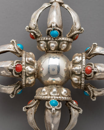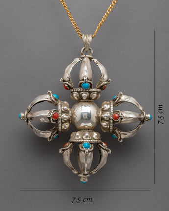 Silver Double Vajra Locket | Double Dorje Pendant With Stone Embroid