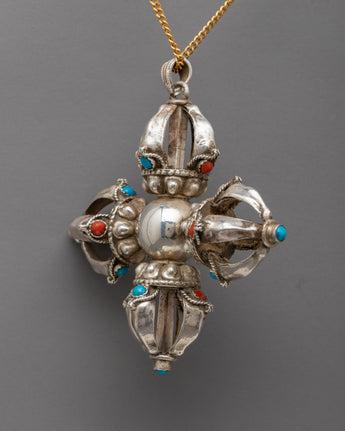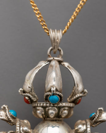 Immerse yourself in the captivating allure of our Sterling Silver Double Dorje Pendant—a true embodiment of the Tibetan Dorje Charm. This exquisite pendant is meticulously fashioned from solid silver, ensuring not only its visual splendor but also its enduring quality. The Double Dorje Pendant gracefully embraces the essence of precious gemstones, including Coral, Irani, and Lapis Lazuli, each radiating vibrant hues and revitalizing energies. This infusion of elegance and vitality enhances the pendant's charm, elevating its enchantment to new heights. A profound symbol of strength and enlightenment, the Double Dorje Pendant stands as a Buddhist Vajra Charm resonating with those in pursuit of spiritual transcendence. Its design is timeless, destined to remain a cherished piece that seamlessly weaves into any jewelry collection, perpetually radiating its allure and significance.
