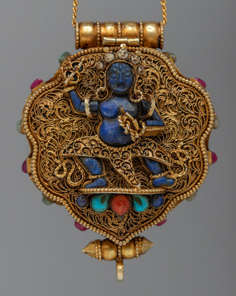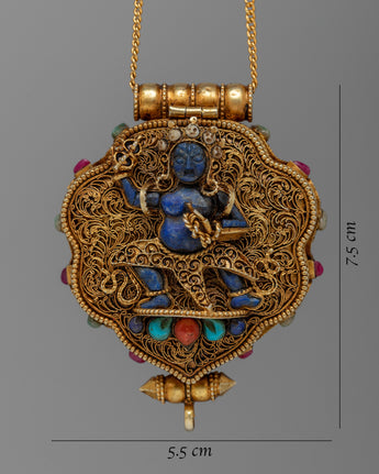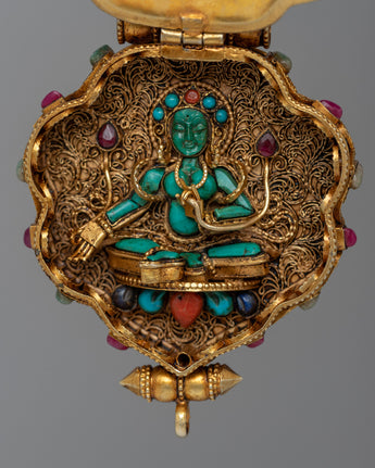 Discover the exquisite artistry of the Silver Ghau Box Locket, which is carefully made by hand from pure silver and set with a vivid mix of gemstones, including lapis lazuli, turquoise, and coral. The locket is enhanced with colors that represent wisdom, healing, and protection by each stone, which was chosen with care for both its color and spiritual value. A finely carved, realistic god figure on the outside acts as the wearer's protector and a symbol of spiritual guidance.