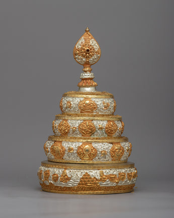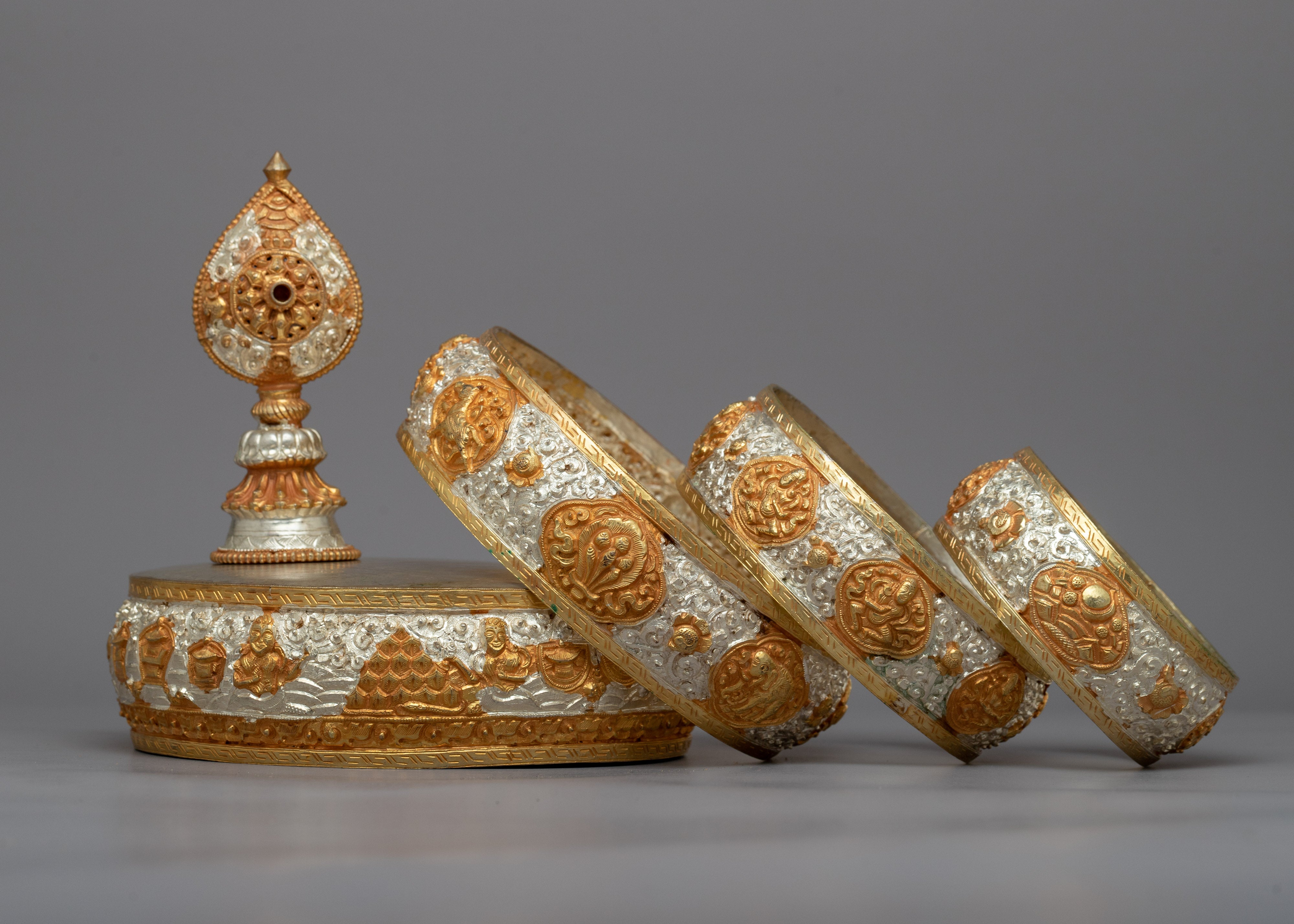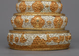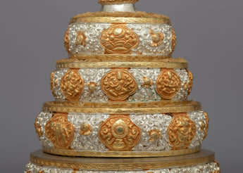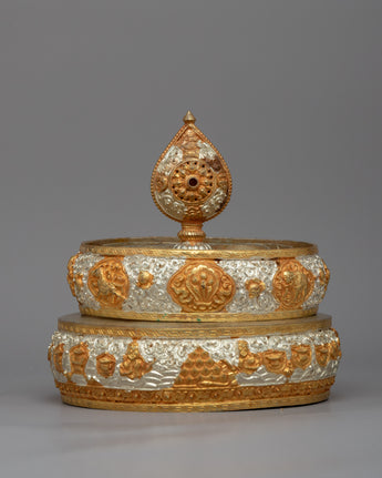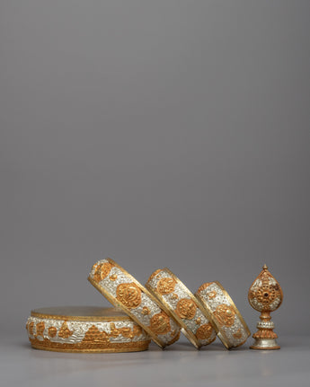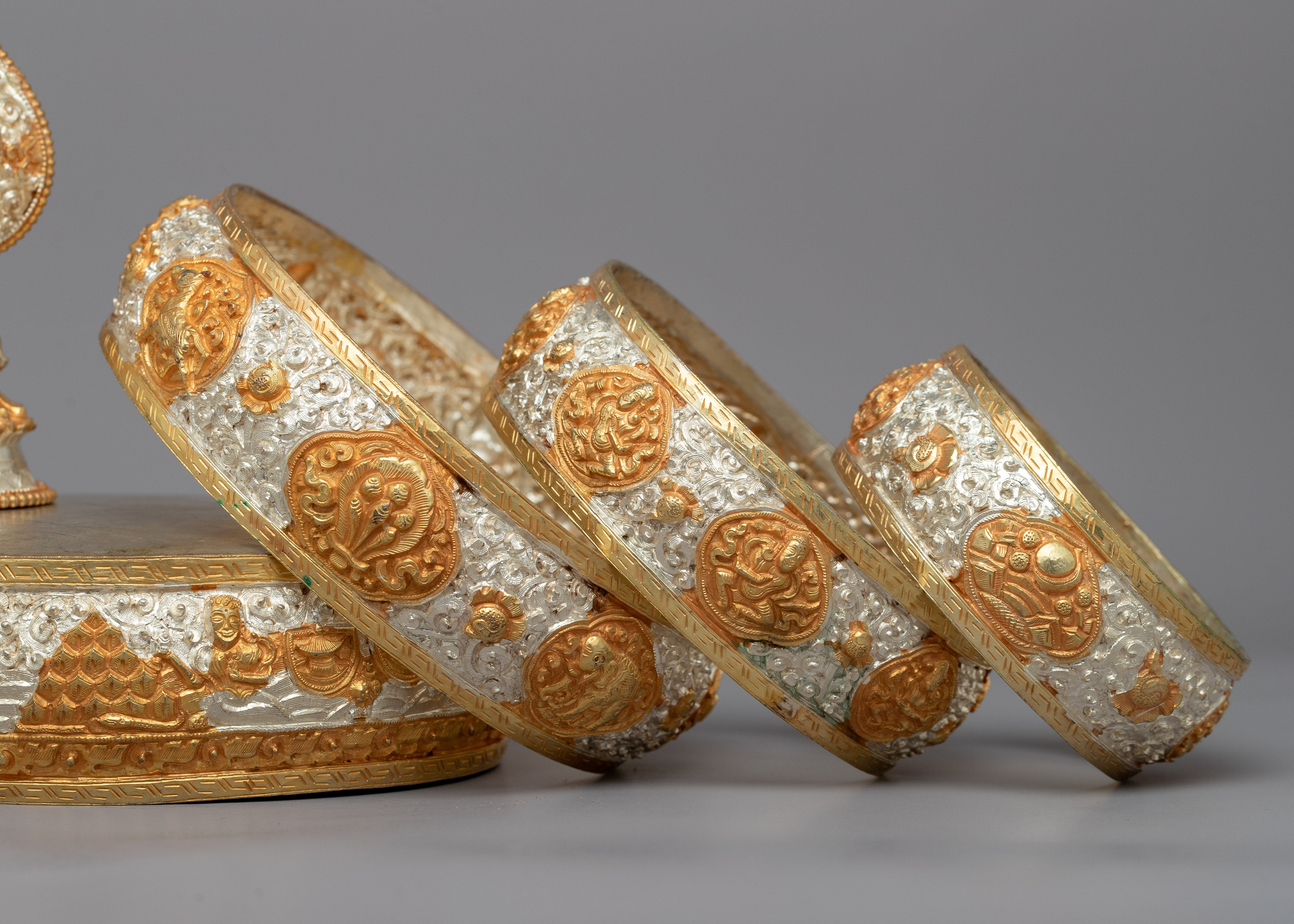 The Silver Mandala Set is a captivating blend of artistry and spirituality. This exquisite set is meticulously handcrafted with a copper body, enhanced by resplendent 24k gold and silver plating, adding opulence and profound symbolism.