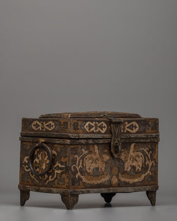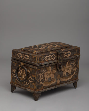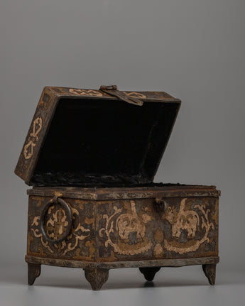 This strong yet decorative treasure box, measuring 19.5 cm in height by 27.5 cm in breadth and weighing 3.28 kg, is suitable for storing ghaus and other sacred things. To construct a peaceful Buddhist shrine, place this treasure box in the center of a clean, uncluttered altar and cover it with a meaningful fabric. This handcrafted box combines craftsmanship and spiritual depth, making it ideal for both practitioners and collectors.