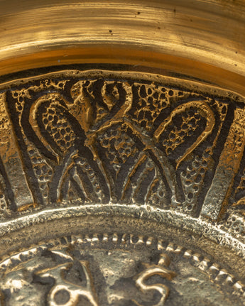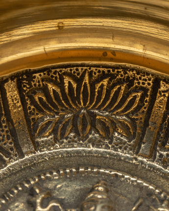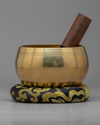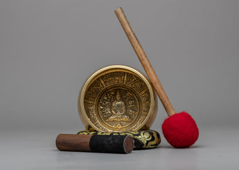 This beautifully carved Singing Bowl was made with inner calm and meditation in mind. It is created from a combination of seven metals, which when played are thought to provide a mellow and comforting sound. The bowl's interior contains a mantra, a sacred chant, or a phrase that heightens its spiritual importance. The Singing Bowl can aid to calm the mind, encourage relaxation, and improve meditation practice when it is played. It is a potent instrument for finding inner harmony, peace, and general wellbeing.