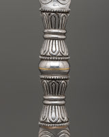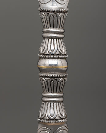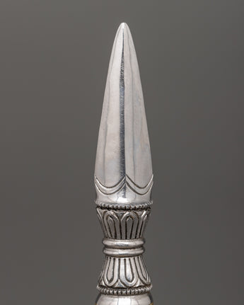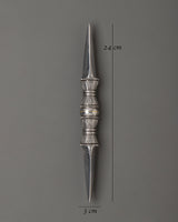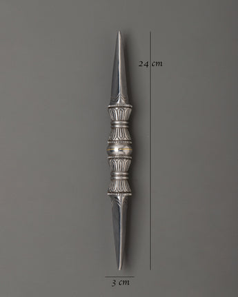 The single-pronged Vajra is a sacred ritual tool used in Tibetan ceremonies and meditation practices. Standing 24 cm tall and 3 cm wide, this 0.31 kg iron vajra is meticulously crafted with traditional Tibetan designs, reflecting the spiritual significance and symbolism of this ancient instrument. With its sharp, single-pronged design, the vajra symbolizes indestructible power and is traditionally used to cut through the illusion of duality, bringing clarity during spiritual practices.
